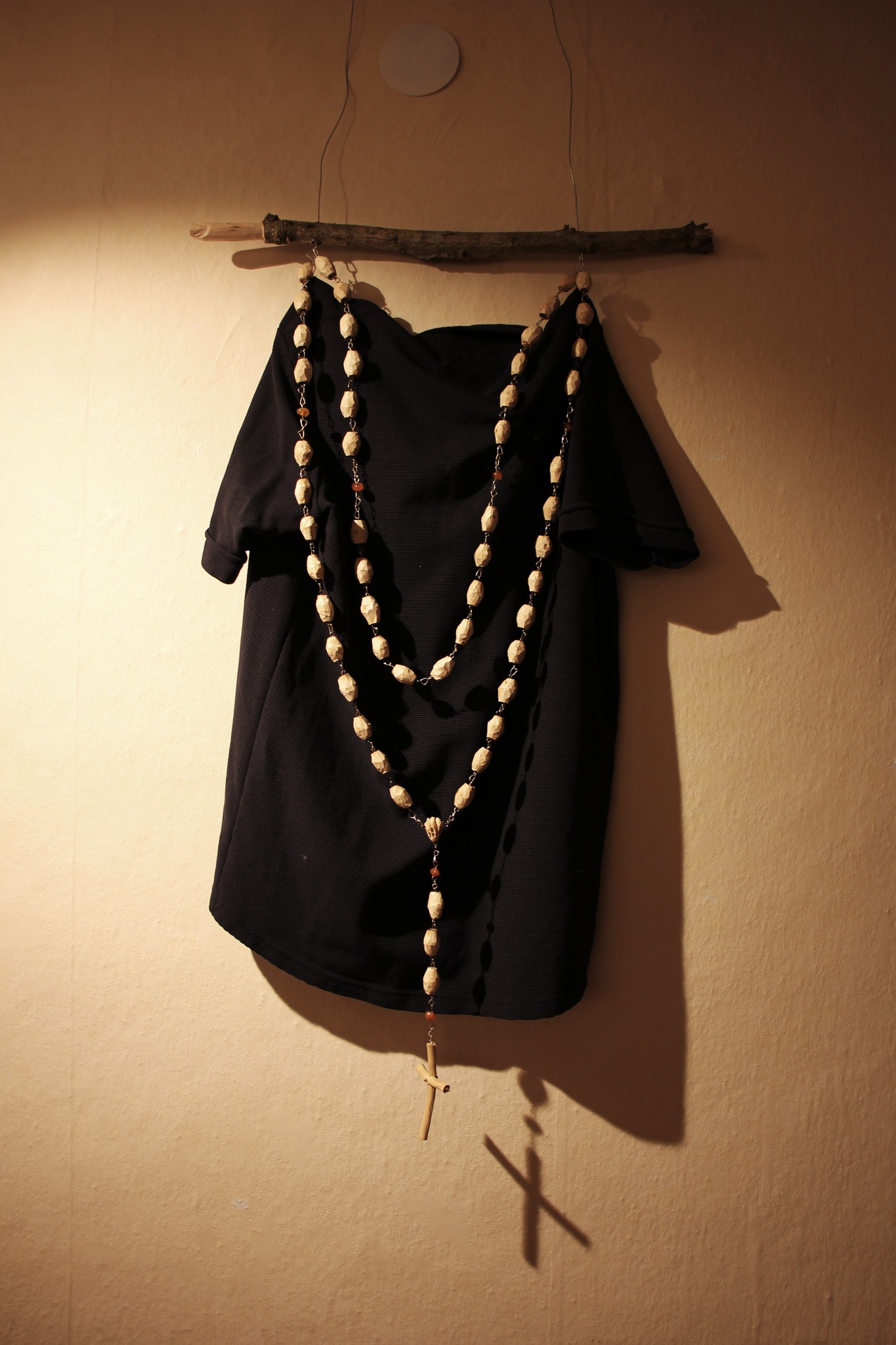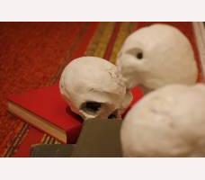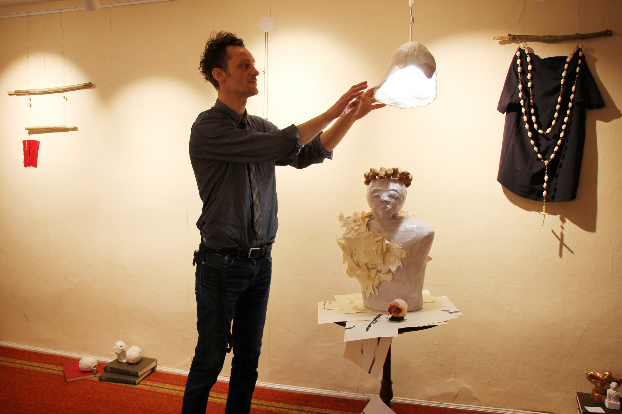 "Ši tema pradėjo vystytis dirbant su pirmais Lietuviškais anamorfiniais objektyvais kompanijoje Aivascope. Užtikau begale makulatūros kuri susikaupė detalių išpakavimo metu. Kiek save kūrybinį kelią prisimenu visada mėgau rastą tinkamą medžiagą perdirbti ir prikelti naujam gyvenimui. Taip prasidėjo papjė mašė technika sukurtų objektų atsiradimas. Už namų / studijos lango netikėtai išvydau pjaunamus apleisto parko medžius, paukščiai neramūs skraidė tarsi skleisdami žinią apie nykstančius namus. Taip su objektyvais atkeliavęs popierius tapo simboliniais į paukščių galvas panašiais šalmais, kurie vienas po kito susiklijavo į visa rinkinį. Šias paukščių galvas paverčiau muzikinio vaizdo klipo personažais (https://youtu.be/dNQaNscbUqw?si=BJDiwLAux5P7_eEc) - baigiau Klaipėdos universiteto menų fakulteto teatro režisieriaus diplomą, todėl režisūra neatsiejama mano gyvenimo dalis. Kiek vėliau galvos tapo šviestuvai, procesą įtakojo Šiauliuose vykusių KILOWAC dirbtuvių iniciatyva. Pilną komplektacija galima išvysti Šumsko Laukininkų dvare.