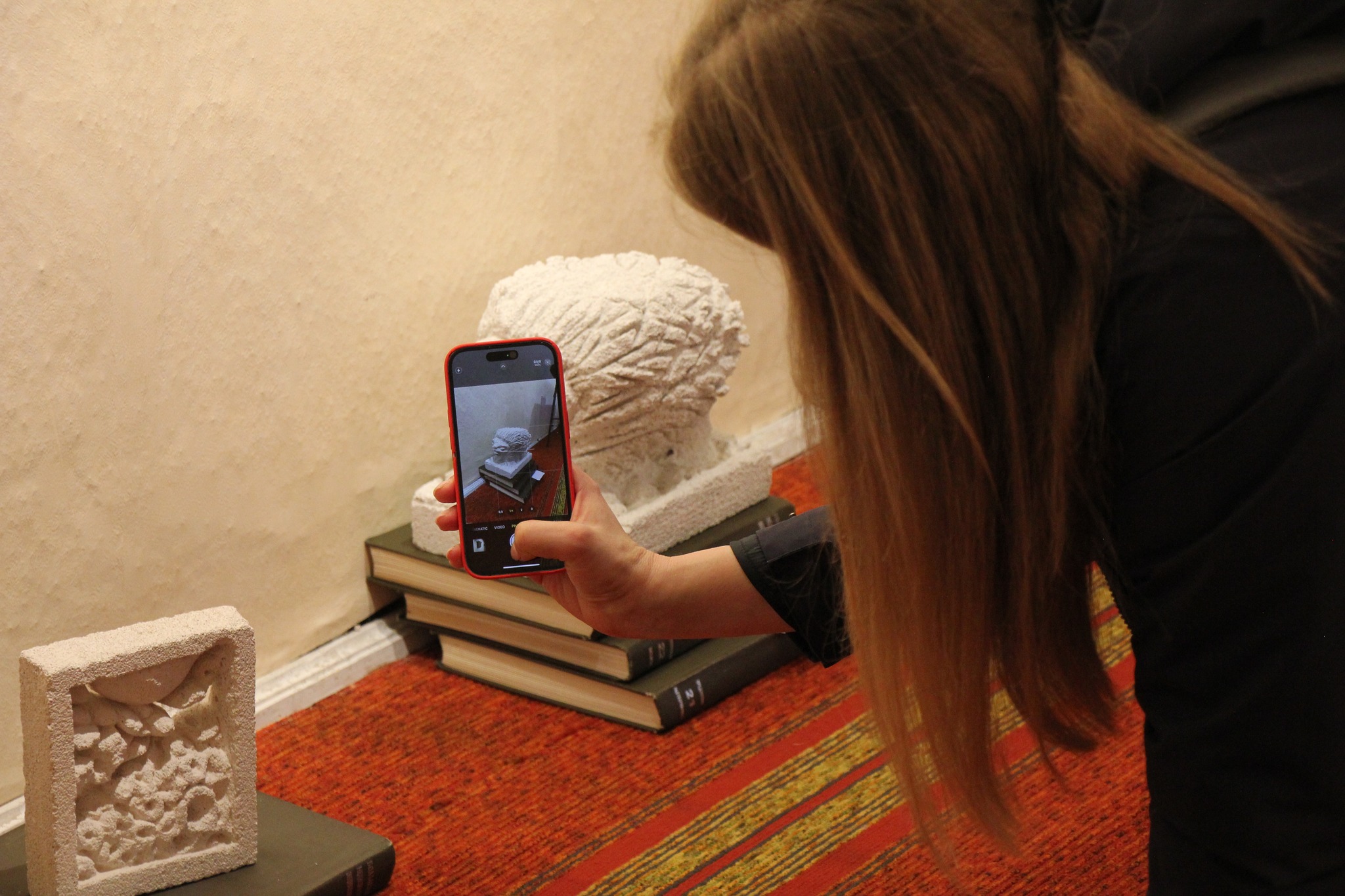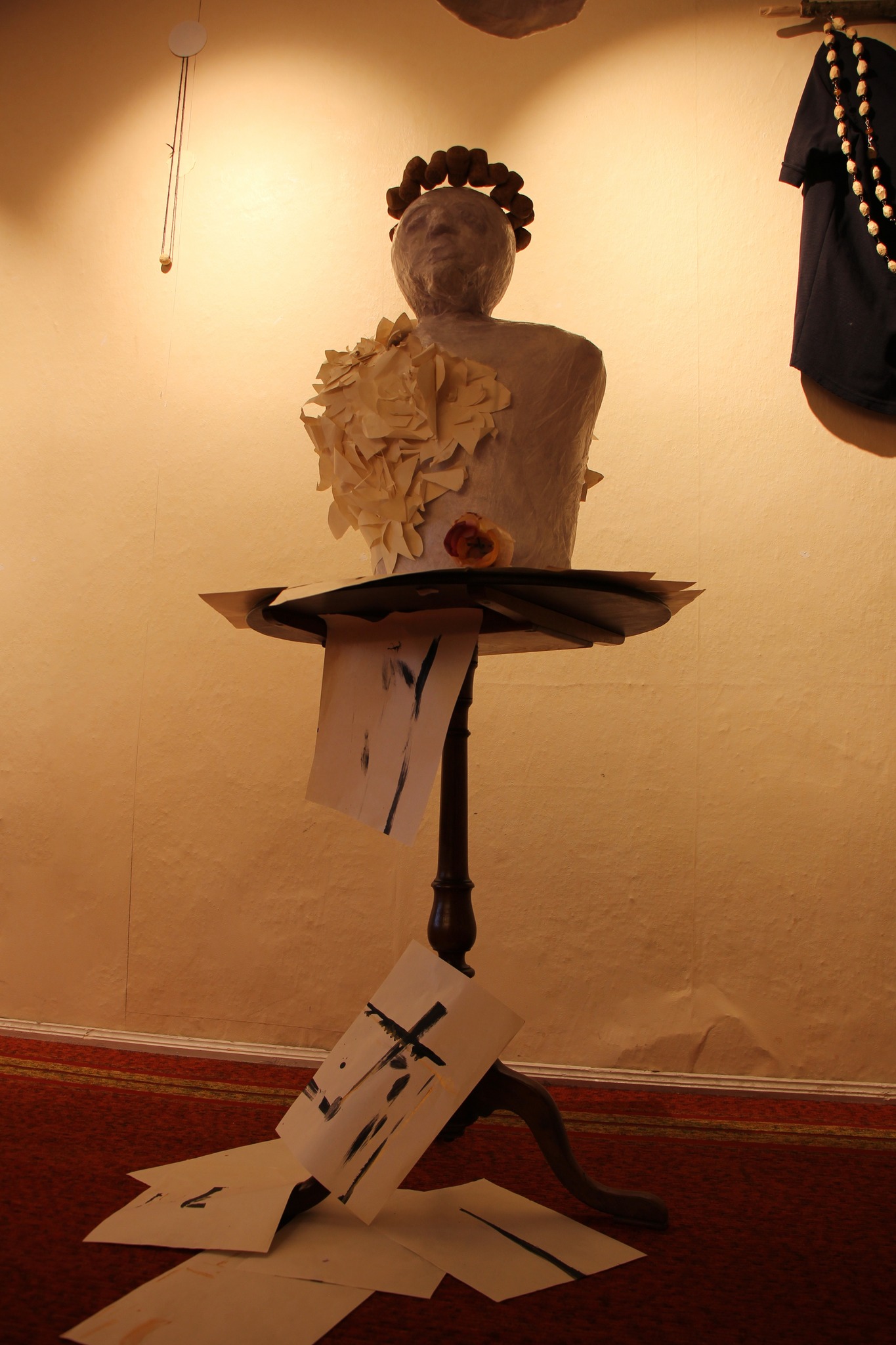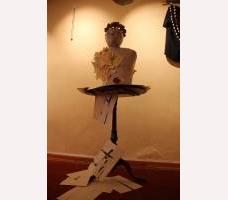 Skulptūra - baltas biustas rudame fone, pavadinimas
